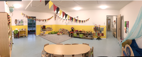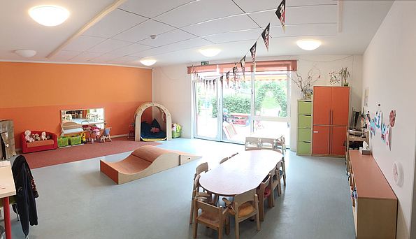 Die hellen und freundlichen Gruppenräume laden zum Bewegen, Bauen, Musizieren und vielen anderen Tätigkeiten ein. Große, bis auf den Boden reichende Fenster, lassen die Kinder so manch spannende Dinge (z.B. Wettererscheinungen, Fahrzeuge und andere Kinder) beobachten.