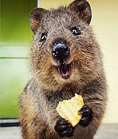 Schon gewusst? In Australien lebt ein kleines Kerlchen, was als der "Dauergrinser" bekannt ist. Das Kurzschwanzkänguru, auch "Quokka" genannt, lebt in Australien. Es kann maximal 60cm groß werden, was so hoch wäre, als wenn wenn ihr 3 Milchpackungen (1L) übereinander stapeln würdet. Auffallend sind seine langen, kräftigen Hinterbeine und seine kurzen Vorderbeine. (Kennt ihr noch ein Tier, was richtig kurze Vorderbeine hat?) Die Quokkas schlafen meistens am Tag und sind daher Nachtaktiv. Das wäre so, als wenn du am Tage schlafen würdest und in der Nacht draußen spielen würdest. Komisch, oder? Wichtig ist noch zu erwähnen, dass diese niedlichen Tiere Pflanzenfresser sind. Am Liebsten ernähren sie sich von Blättern, Gräsern und Kräutern. Das macht sie so stark und gesund, dass die Tiere bis zu 10 Jahre alt werden können. Leider gibt es auch etwas trauriges, denn die Tierart gilt auf der Welt als "gefährdet" und dass bedeutet, es gibt nicht mehr viele von ihnen. Noch etwas lustiges zum Schluss? In Australien lassen sich die Menschen gerne mit Quokkas fotografieren. Warum? Weil die Quokkas wirklich immer lächeln. Selbst wenn es regnet. Für so viel Fröhlichkeit gibt es von uns beide Daumen hoch!