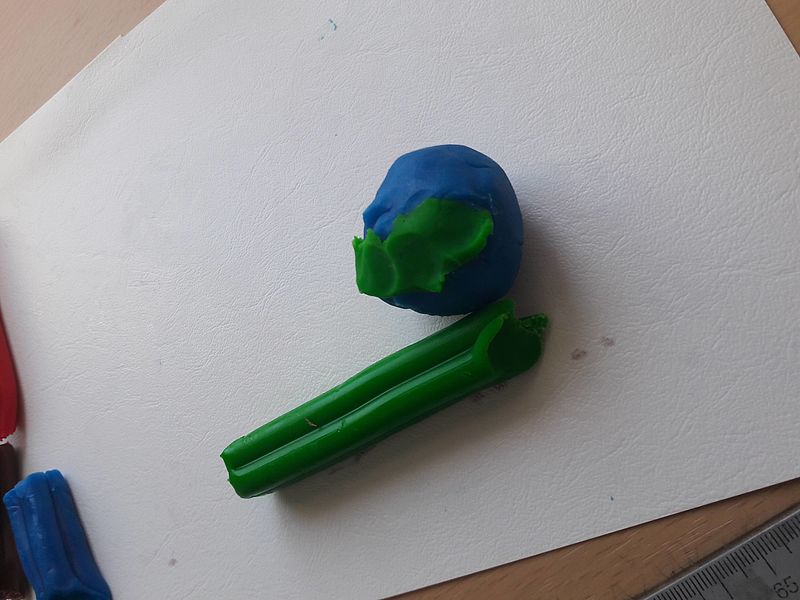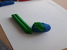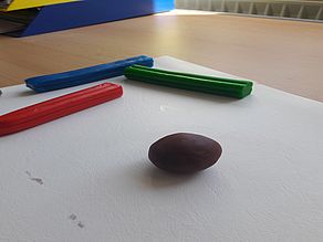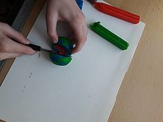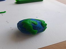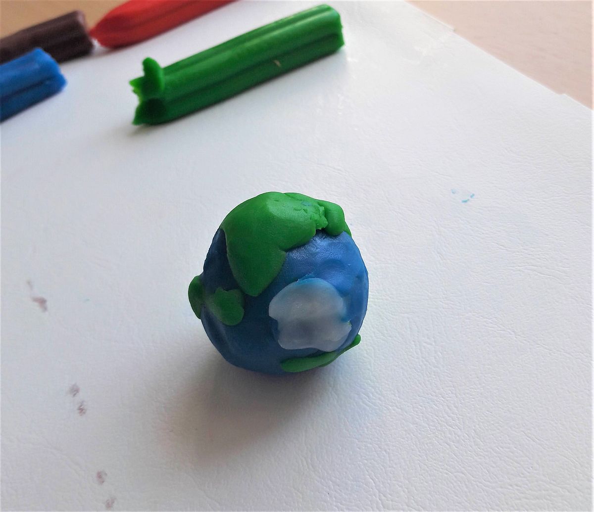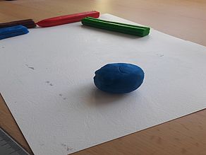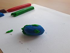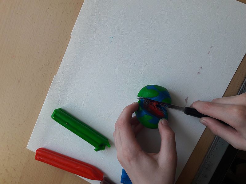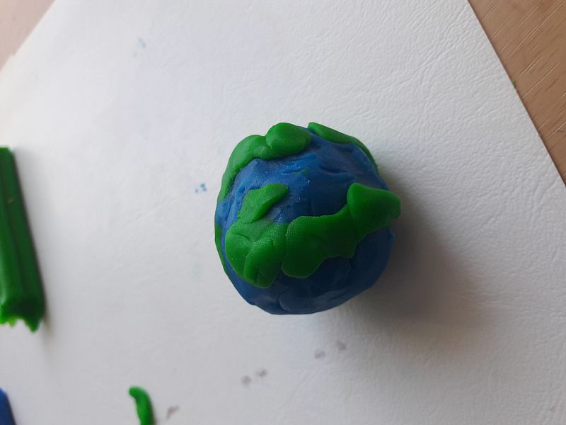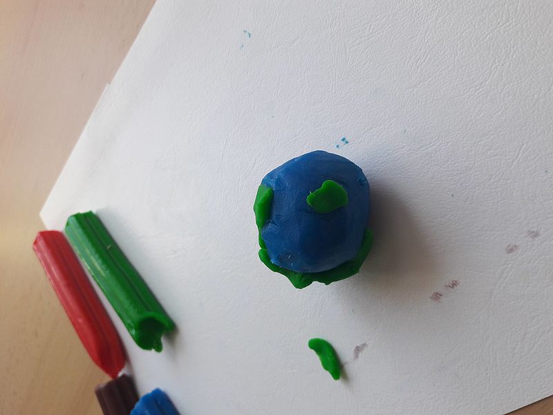 Über die Hälfte unserer Erdoberfläche ist mit Wasser bedeckt. Wickel deine Kugel komplett in blaue Knete ein! Rolle deine blaue Kugel so lange auf der Unterlage, bis sie schön rund ist!