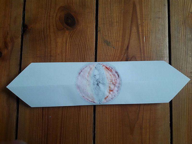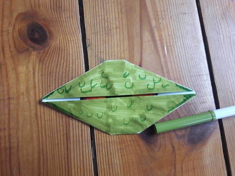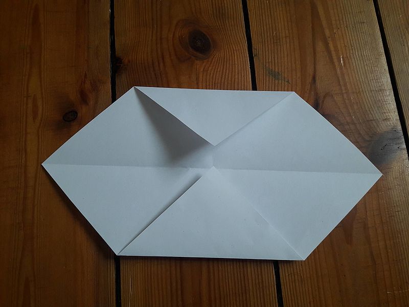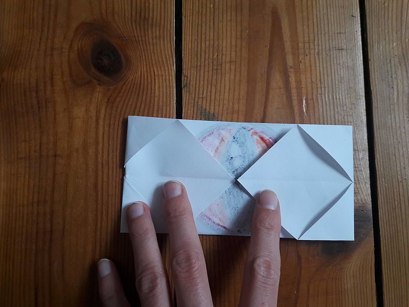 Falte jede Ecke, sodass an beiden Seiten eine Spitze entsteht! Lass dir dabei helfen! Nun müsste dein blatt die Form eines Auges haben.