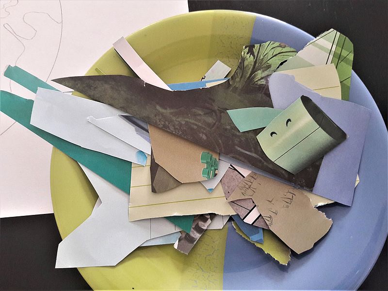 Reiße aus deiner alten Zeitschrift viele kleine blaue und grüne Schnipsel!