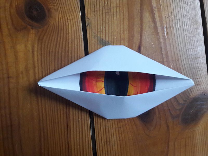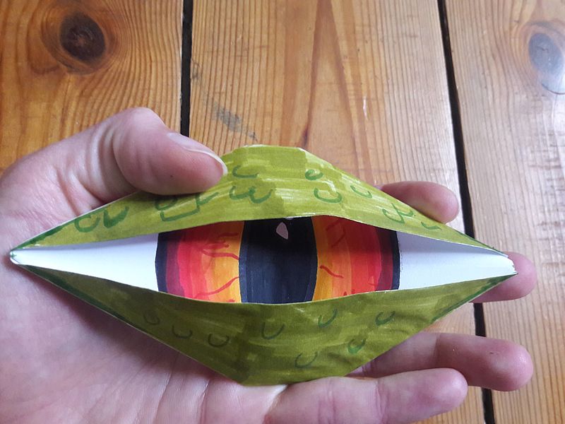 Heute zeige ich dir, wie man ein Drachenauge faltet. Du kannst auch das Auge eines anderen Tieres oder dein eigenes Auge nachbasteln. Das Besondere ist, dass dieses Auge blinzeln kann. Probiere es mal!
