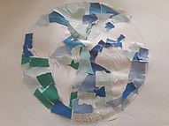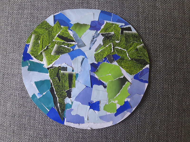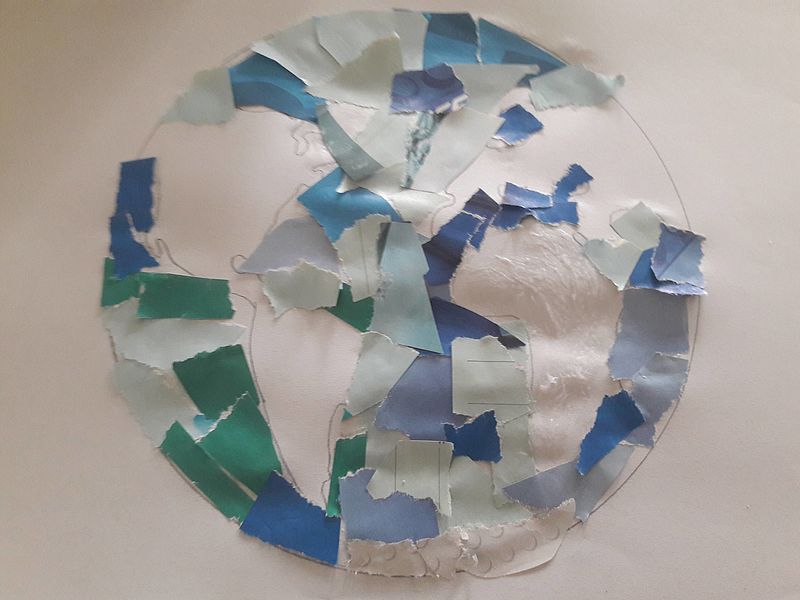 Die blauen Schnipsel sind das Wasser der Erde. Klebe sie um deine aufgemalten Kontinente!