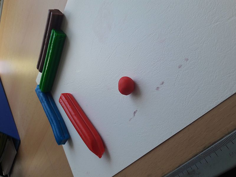 Unsere Erde ist eine Kugel, wie ein Ball. In der Mitte hat sie einen Kern aus ganz heißem Stein. Knete eine kleine rote Kugel!