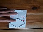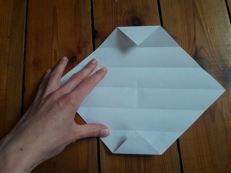 Falte die obere und untere Spitze bis zur zweiten Linie! Oben und unten siehst du jetzt kleine Dreiecke.