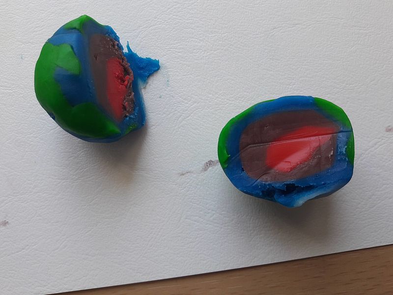 Um den Kern ist noch eine Schicht, dann kommt die harte Erdkruste. Wickel die Kugel komplett in braune Knete ein!