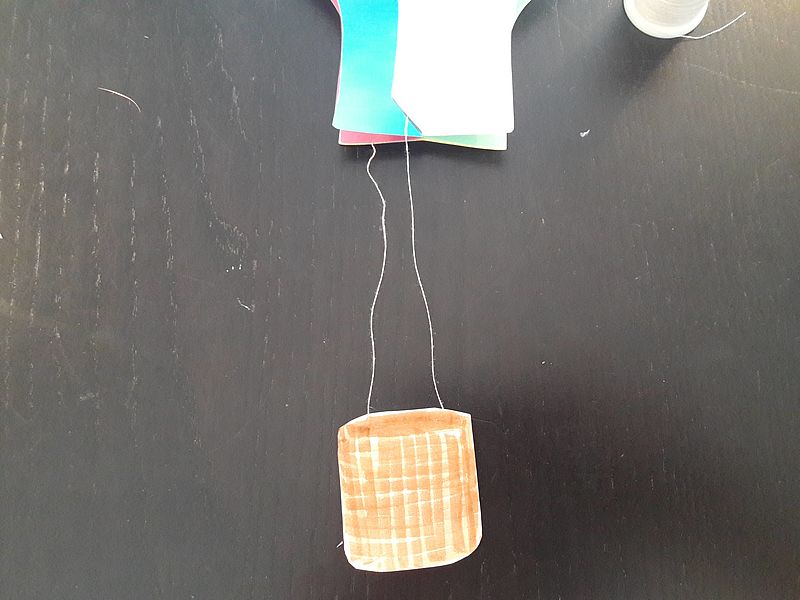 Nun kannst du aus den Papierresten einen Korb für den Ballon ausschneiden und anmalen. Befestige den Korb mit dem Faden am Ballon! Bringe noch einen Faden zum Aufhängen an! Das geht mit Klebestreifen, Tacker oder Nadel. Lass dir dabei helfen!