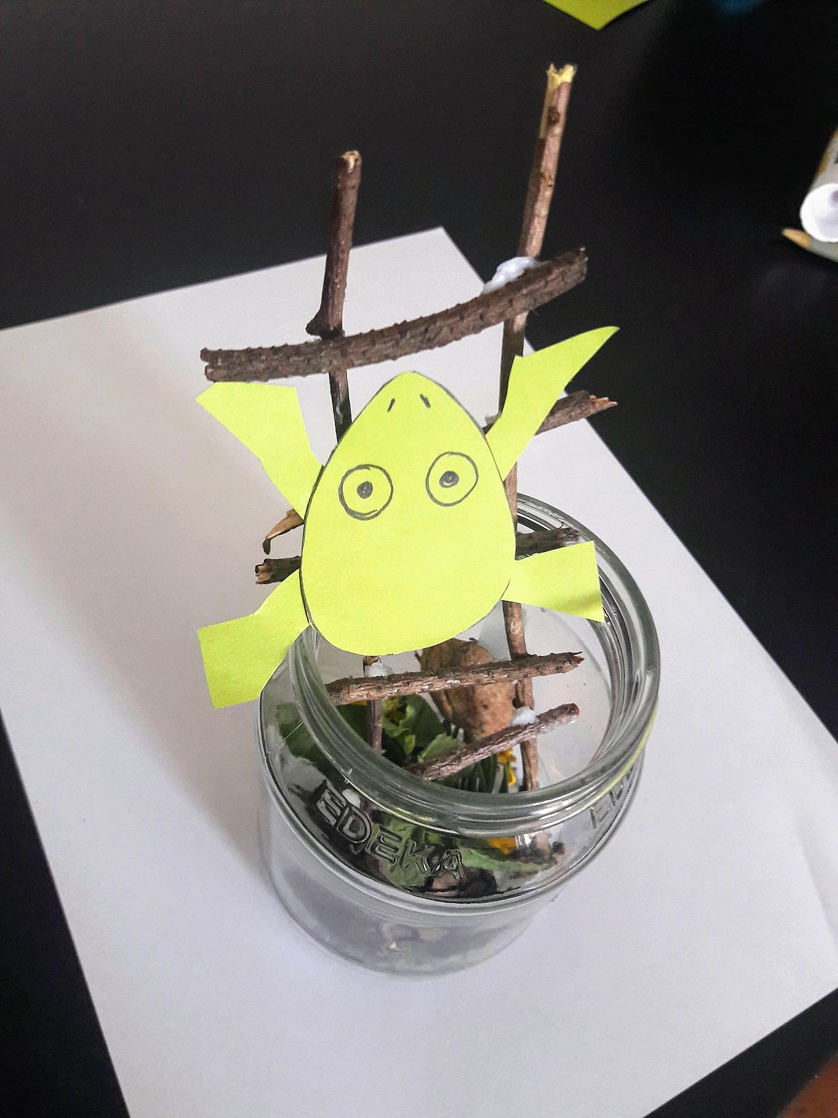Wenn alles getrocknet ist, stell die Leiter ins Glas! Setze deinen Frosch ins Glas oder klebe ihn an die Leiter!