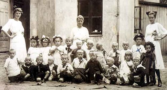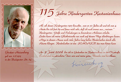 "Als ich diesen Kindergarten 1923 besuchte, war er 30 Jahre alt und ich war vier. Heute bin ich fast 89 und freue mich sehr, dass ich noch immer aus "meinem" Kindergarten Grüße und Einladungen zu besonderen Anlässen erhalte.