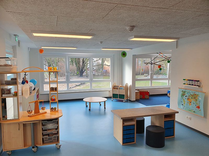Helle und moderne Räume prägen das Bild unserer Kita. Dabei schaffen kindgerecht konzipierte Funktionsräume Anlässe, die Umgebung eigenständig zu erkunden und persönliche Interessen nachzugehen. Großzügig angelegte Flächen bieten den Kindern außerdem ausreichend Raum um zu entdecken, zu forschen und zu lernen. Anregende Spielmaterialien, große Fenster und ein maritimes Ambiete ergänzen unsere funktionalen Räumlichkeiten und schaffen Wohlfühlatmosphäre.