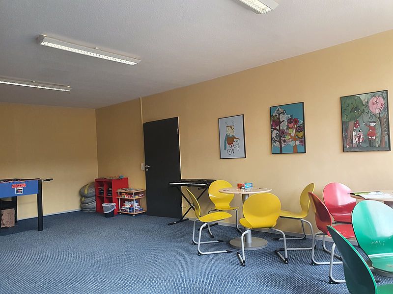 Im Kindertreff kannst du am Tischkicker gegen deine Freunde antreten. Nimm dir eine Zeitschrift und mache es dir auf einem Sitzkissen oder auf dem Sofa gemütlich. Um eines der Brett- und Kartenspiele zu spielen, sind genug Tische und Stühle im Kindertreff vorhanden.