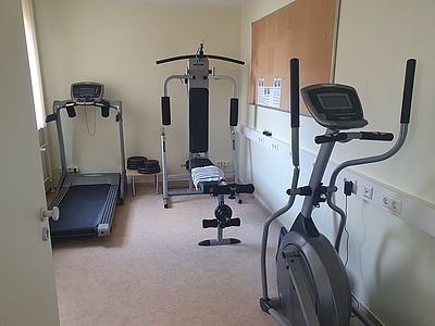 Im Kraftraum könnt ihr auf der Hantelbank Gewicht stemmen oder eure Kondition und Ausdauer auf dem Laufband oder dem Crosstrainer verbessern. Auch draußen könnt ihr euch bei Fußball oder Basketball verausgaben.