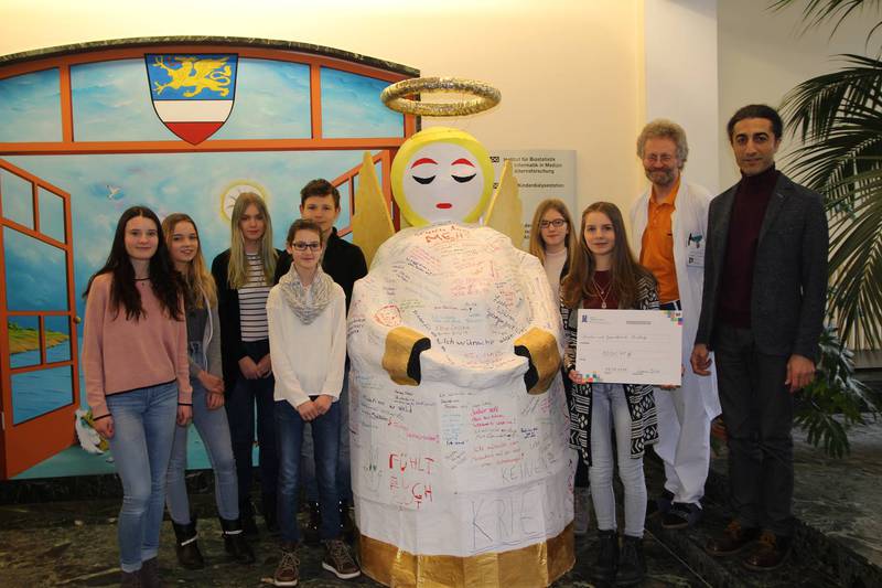 Der Engel durfte bei Konzerten im Barocksaal, Koservatorium und in der Schule mit guten Wünschen beschrieben werden - gegen einen Obolus. 1201,75 Euro schenkten die Jugendlichen nun der Kinderonkologie. Chefarzt Prof. Dr. Carl Friedrich Classen bedankte sich im Namen der kranken Kinder für das tolle Engagement!
