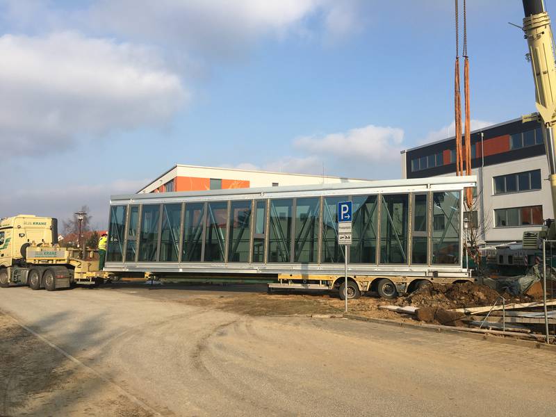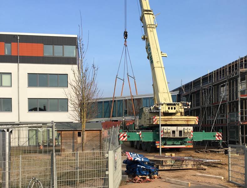 Donnerstag, den 9. Februar, etwa lieferte die Baustelle Schaulustigen besonders spektakuläre Bilder. Da wurde der Neubau nämlich mittels einer geschlossenen Brücke mit dem bereits existierenden Schulgebäude der Kinder- und Jugendkunstakademie verbunden. Innerhalb von rund zwei Stunden wurde mithilfe einer gehörigen Portion Fingerspitzengefühls der rund 14,5 Tonnen schwere und 16,5 Meter lange sowie 2,6 Meter breite Verbindungsweg in der Höhe positioniert.