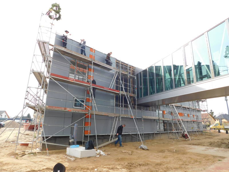 Rostock-Kassebohm, 31. März 2017. Auf den Tag genau vor einem Jahr wurde der 1. Spatenstich vorgenommen, nun hängt die Richtkrone, als Beweis dafür, dass der Rohbau abgeschlossen wurde und mit dem Innenausbau begonnen werden kann. Bis hierher wurden in den vergangenen zwölf Monaten 1.500 Kubikmeter Boden ausgehoben und 1.200 Kubikmeter Kies im Gegenzug eingebracht. Außerdem wurden rund 1.000 Quadratmeter Kalksteinsandwände hochgezogen, über 320 Tonnen Baustahl verbaut und mehr als 16 Kilometer Kabelleitungen verlegt.