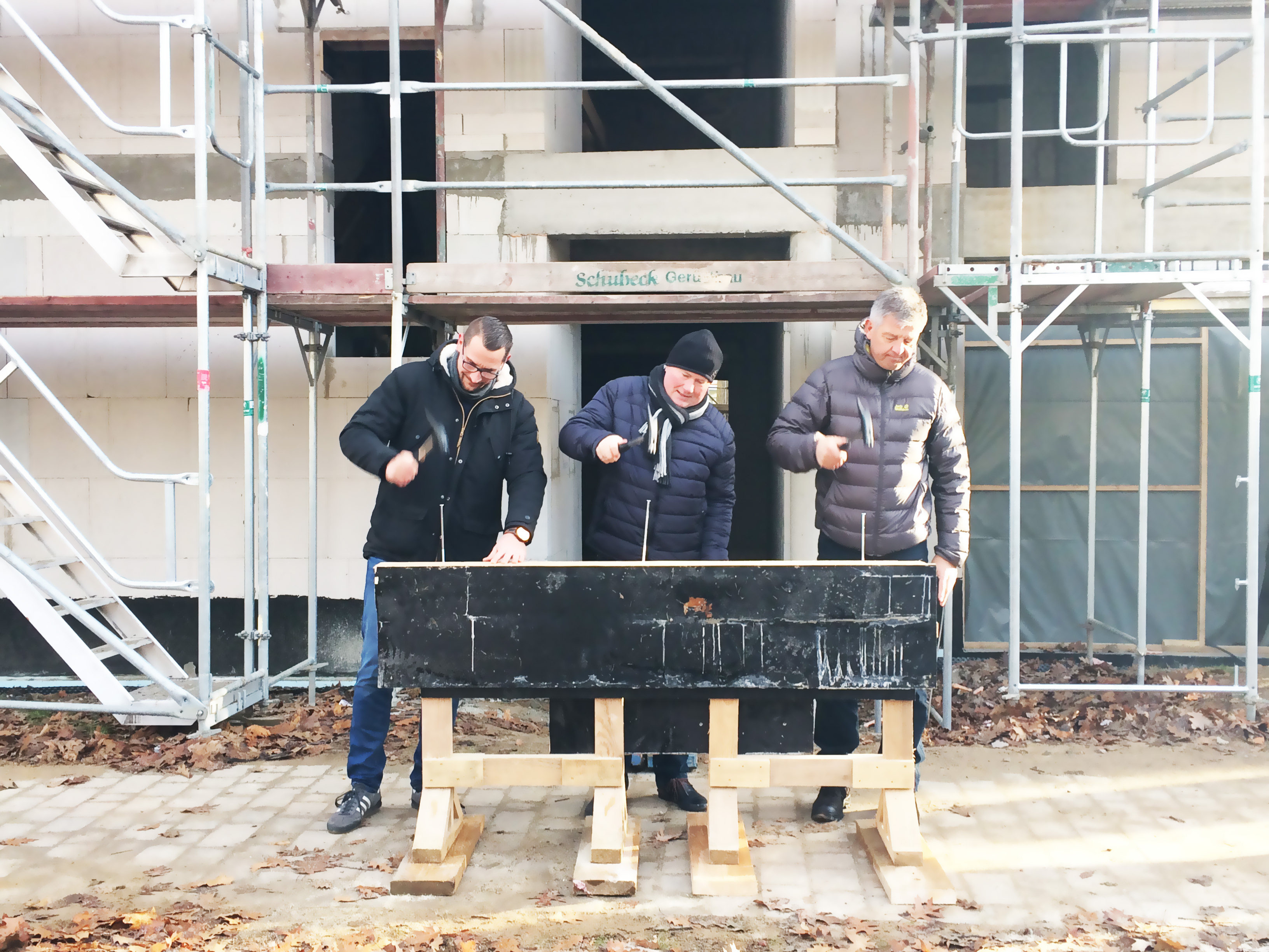 (v.li.) Hortleiter André Nehls, ILL-Geschäftsführer Sergio Achilles und Oberbauleiter (NOBA) Thomas Grzesko schlagen den symbolischen Nagel ein.