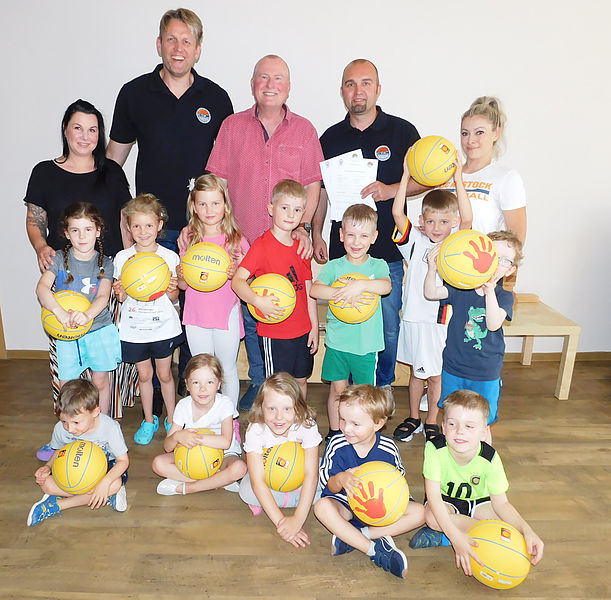 (v.li. Kita-Leiterin Annetta Küster, Jens Hakanowitz, sportlicher Leiter der Rostocker Seawolves, Sergio Achilles, Geschäftsführer des Instituts Lernen und Leben e.V., André Jürgens, 1. Vorsitzender des EBC Rostock e.V. und Trainerin Dani freuen sich über die gemeinsame Kooperation – die Kinder sowieso)